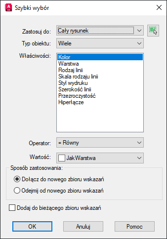 Uwaga: Opcja Nazwa jest zgodna z nazwanymi obiektami, takimi jak nazwy bloków, ale również z typem obiektów nienazwanych, takich jak linie i okręgi.