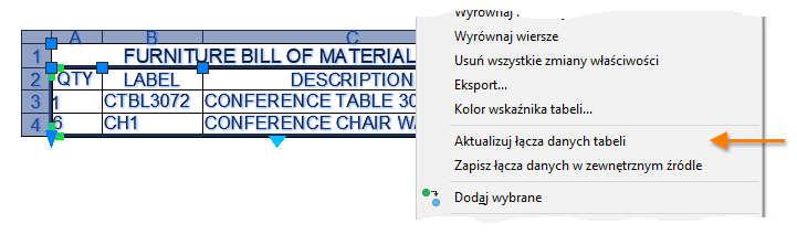Dane wyodrębnione i umieszczone w tabeli można zaktualizować przy użyciu pierwotnych ustawień wyodrębnionych danych. Przykładowo po dodaniu nowych dodatkowych bloków do rysunku można zaktualizować łącze danych powiązane z tabelą w celu uwzględnienia najnowszej liczby bloków bez konieczności powtarzania procesu wyodrębniania.