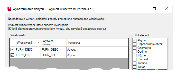 - W obszarze Filtr kategorii usuń zaznaczenie wszystkich opcji, z wyjątkiem opcji Atrybut, a następnie upewnij się, że zaznaczone właściwości odpowiadają wartościom atrybutów do wyodrębnienia.