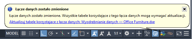 Wskazówka: Jeśli co najmniej jedna tabela na rysunku zawiera wyodrębnione dane, na pasku systemowym w oknie aplikacji AutoCAD zostanie wyświetlona ikona Łącza danych. Wyświetlaną ikonę można kliknąć prawym przyciskiem myszy, aby zaktualizować łącza danych na rysunku i nimi zarządzać. Wygląd i funkcjonalność ikony Łącza danych określa zmienna systemowa DATALINKNOTIFY.