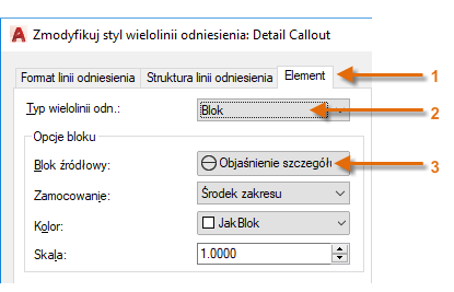 Aby na przykład utworzyć styl „objaśnienie szczegółu”, uruchom polecenie WIELOLODNSTYL. W oknie Menedżer stylów wielolinii odniesienia kliknij przycisk Nowy i wybierz opisową nazwę nowego stylu wielolinii odniesienia. Kliknij kartę Element i wybierz Blok, a następnie Objaśnienie szczegółu, jak pokazano na rysunku.