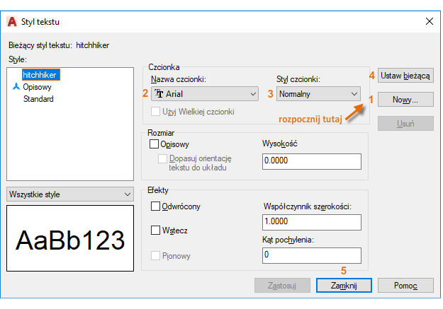Podczas tworzenia nowego stylu tekstu należy najpierw nadać mu nazwę, a następnie wybrać czcionkę i jej styl. Kolejność klikania przycisków pokazano poniżej.