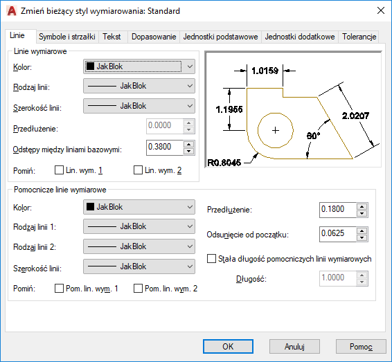 Domyślny styl wymiaru nosi nazwę Standardowy (jednostki calowe) lub ISO-25 (metryczne). Jest on przypisywany do wszystkich wymiarów do momentu ustawienia innego stylu jako bieżącego stylu wymiarowania.