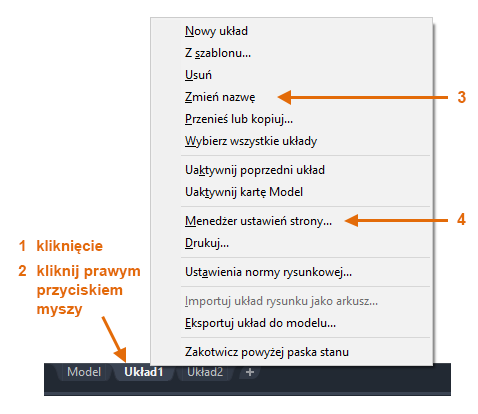 Pierwszą czynnością, którą powinno się wykonać po przejściu na kartę układu (1) jest kliknięcie jej prawym przyciskiem myszy (2) i zmiana jej nazwy (3) na bardziej szczegółową niż Układ 1. Dobry wybór mogą stanowić nazwy odnoszące się do określonego rozmiaru ANSI lub ISO.
