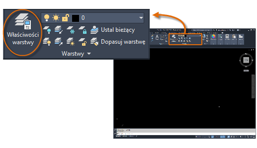 Menedżer właściwości warstw zajmuje dużo miejsca i nie wszystkie opcje są zawsze potrzebne. Aby uzyskać szybki dostęp do najczęściej używanych elementów sterujących warstwami, użyj elementów wstążki. Jeśli żadne obiekty nie są wybrane, w panelu Warstwy na karcie Narzędzia główne wyświetlana jest nazwa bieżącej warstwy, jak pokazano poniżej.