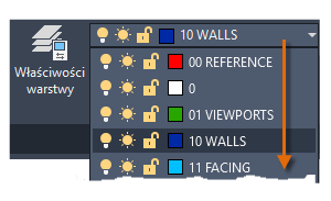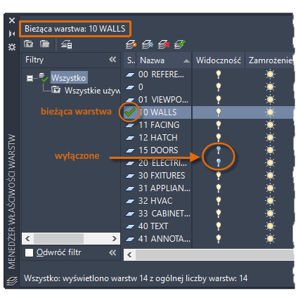 Jak widać na ilustracji, warstwa 10 WALLS jest warstwą bieżącą. Wszystkie nowe obiekty są automatycznie umieszczane na tej warstwie. Na liście warstw zielone pole wyboru obok warstwy 10 ŚCIANY potwierdza, że jest to warstwa bieżąca.