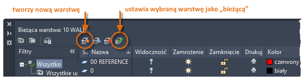 Aby utworzyć nową warstwę, kliknij pokazany przycisk i podaj jej nazwę. Aby ustawić inną warstwę jako bieżącą, kliknij ją, a następnie kliknij wskazany przycisk.