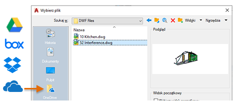 W przypadku posiadania konta u dostawcy usługi przechowywania w chmurze można je dodać do paska Miejsca w oknach dialogowych wyboru plików programu AutoCAD w celu bezpośredniego przejścia do rysunków na koncie przechowywania w chmurze. Wystarczy kliknąć prawym przyciskiem myszy pasek Miejsca i wprowadzić nazwę i ścieżkę do skrótu dotyczącego nawigacji.