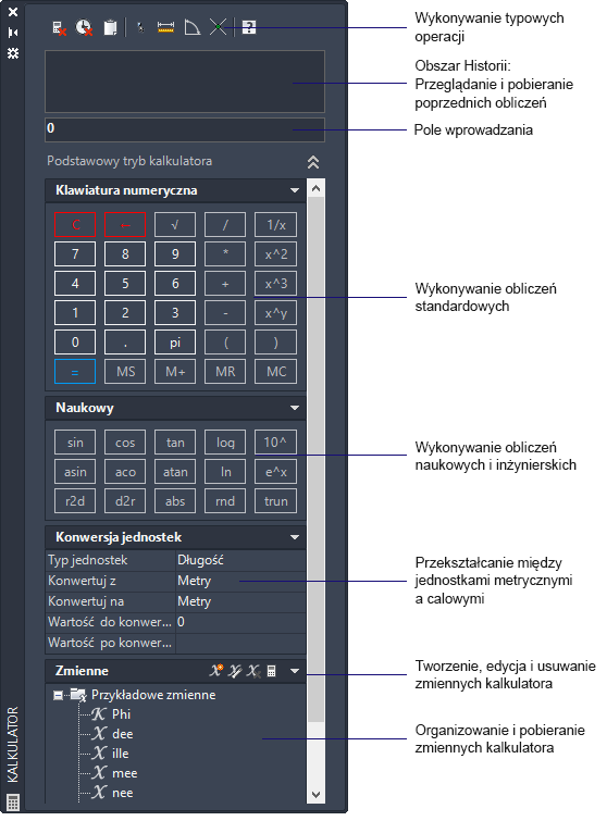 Kalkulator oprócz podstawowych funkcji występujących w kalkulatorach naukowych zawiera funkcje geometryczne, konwersje jednostek i zmienne.