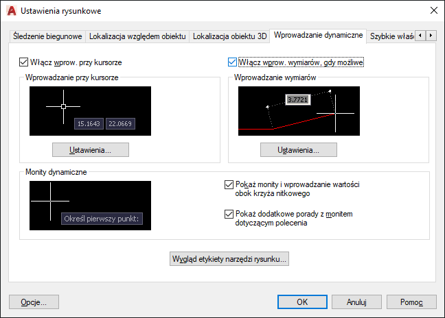Steruje wprowadzaniem przy kursorze, wprowadzaniem wymiarów, monitowaniem dynamicznym i wyglądem etykiet narzędzi rysunku.