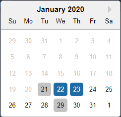 Na przykład jeśli klikniesz filtr kalendarzowy, wybierz co najmniej dwie daty, aby ustalić zakres. Daty początkowo zaznaczone na szaro to daty z co najmniej jedną dostępną zapisaną historią wersji. Daty, które użytkownik określasz, są podświetlone na niebiesko.