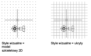 Można zmienić styl wyświetlania siatki z użyciem kilku opcji na kartach Skok i Siatka okna dialogowego Ustawienia rysunkowe. Przykładowo siatka jest domyślnie wyświetlana jako szyk prostokątny linii, jednak gdy styl wizualny jest ustawiony na Model szkieletowy 2D, można zmienić jej styl na starszy w postaci siatki składającej się z punktów.