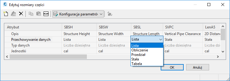 - Aby dodać listę dostępnych rozmiarów części, zmień jej parametr typu przechowywania danych na Lista.