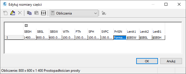 Uwaga: W oknie dialogowym Edytuj rozmiary części nie można edytować obliczonych wartości zdefiniowanych w modelu. Aby zmienić te wartości, należy dokonać edycji modelu.