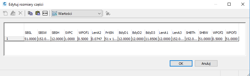 - Aby dodać nowe rozmiary części, kliknij wartość parametru, a następnie kliknij przycisk Edytuj na pasku narzędzi.