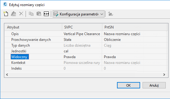 Zostanie wyświetlone okno dialogowe Edytuj rozmiary części zawierające wszystkie dostępne obecnie parametry rozmiaru wybranej części. Dla przykładowej prostej struktury walcowej domyślnymi parametrami rozmiaru są między innymi Nazwa rozmiaru części (PrtSN) i Pionowa szczelina rury struktury (SVPC).