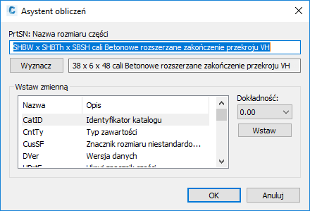 Ważne: Nazwa rozmiaru części generowana jest przy użyciu funkcji FormatNumber języka VB (Visual Basic) Script i prostych podstawień ciągów. Kluczowe znaczenie ma stosowanie poprawnej składni. Należy skorzystać z Kalkulatora, aby potwierdzić poprawność ciągu.