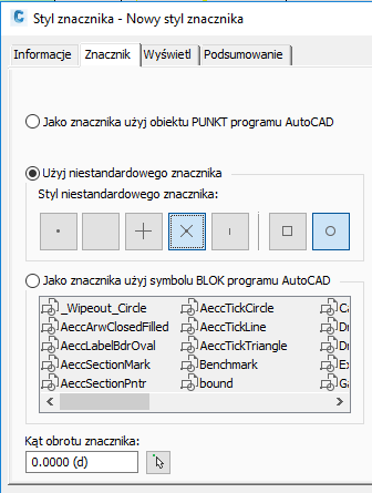 Style znacznika można skonfigurować w taki sposób, aby używać punktów programu AutoCAD, niestandardowych symboli znacznika lub bloków.