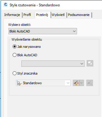 Obiekty rzutowane w widokach przekroju wykorzystują następujące style: