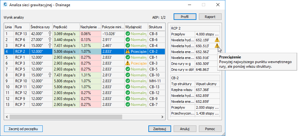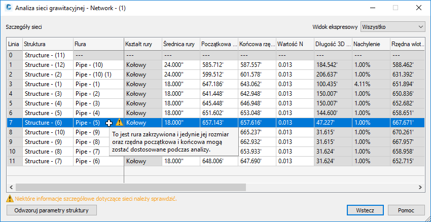 Po wybraniu wiersza w tabeli wyników w prawym panelu są wyświetlane szczegółowe informacje o rurze i strukturze w wybranej linii.