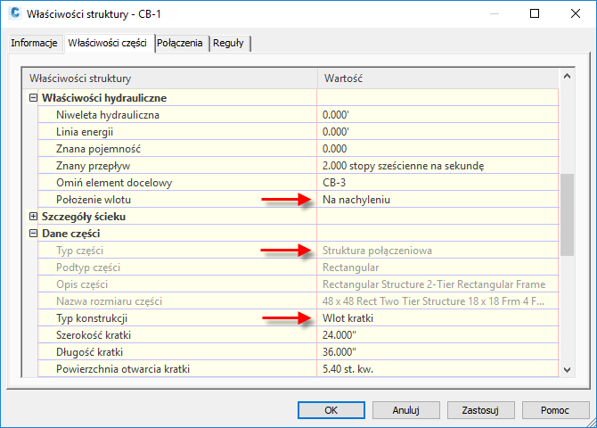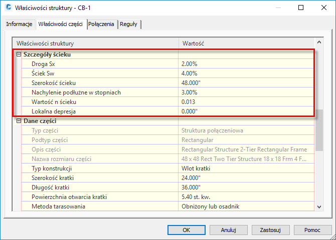 Można użyć sekcji Szczegóły ścieku w oknie dialogowym Właściwości struktury, aby określić właściwości obszaru jezdni wokół wlotu. Właściwości te są używane przez polecenie Analizuj sieć grawitacyjną do obliczeń analizy wlotów.