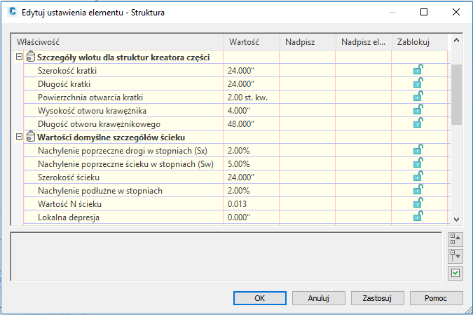 Domyślne ustawienia struktur można określić w oknie dialogowym Edytuj ustawienia elementu — Struktura.