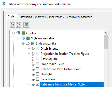 Zaznacz pola wyboru dla stylów i ustawień, do których mają domyślnie istnieć odniesienia. W poniższym przykładzie wybrano styl znacznika szablonu odniesienia.