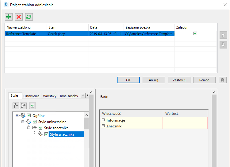 Po dołączeniu szablonu dolna część okna dialogowego zostanie rozwinięta, aby umożliwić zapoznanie się z ustawieniami. Wyświetlane i wybierane są style i ustawienia wybrane w szablonie odniesienia.
