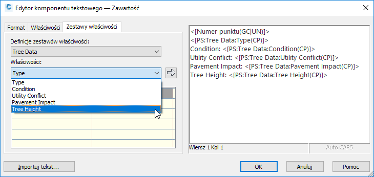 Ten zestaw właściwości należy zastosować do punktów, a następnie dodać odpowiednie dane zestawu właściwości do etykiety stylu rzutowania za pomocą Edytora komponentu tekstowego.