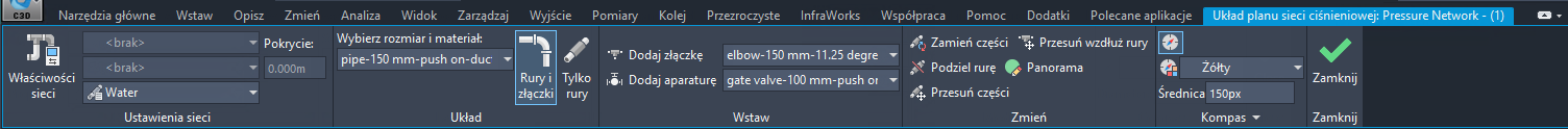- Kliknij przycisk OK, aby wyświetlić wstążkę Układ planu sieci ciśnieniowej.