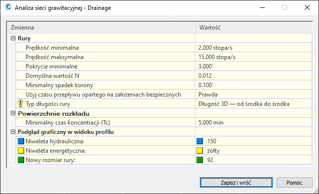 Uwaga: Współczynnik chropowatości przypisany bezpośrednio do każdej z rur jest wykorzystywany do obliczania niwelety energetycznej i hydraulicznej.