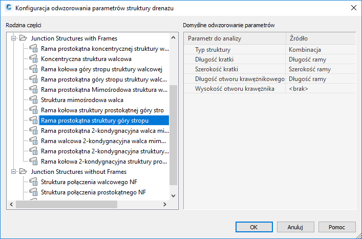 Okno dialogowe Konfiguracja odwzorowania parametrów struktury drenażu