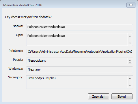 Podczas wczytywania dodatku produktu innej firmy niż Autodesk zostanie wyświetlone nowe okno dialogowe. Teraz można wybrać, czy zezwolić na wczytanie dodatku czy go zablokować. To ustawienie jest zachowywane w kolejnych sesjach. Za pomocą Menedżera dodatków można sprawdzić i zmienić ustawienia zezwolenia/blokowania.