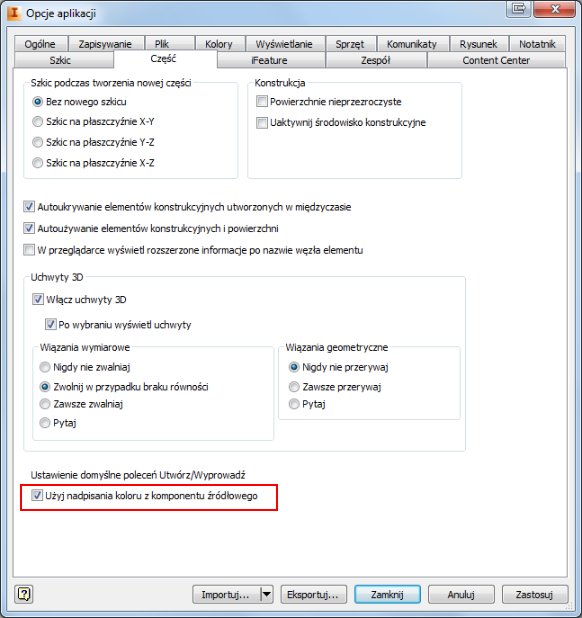 Jest dostępna nowa opcja Użyj nadpisania koloru z komponentu źródłowego do okien dialogowych Zespół pochodny, Część pochodna, Utwórz część i Utwórz komponent. To pole wyboru po zaznaczeniu wstawia wygląd części oraz kolor bryły, elementu lub powierzchni z części pochodnej do nowej. Jeśli ta opcja nie jest zaznaczona, wygląd jest ustawiany jako domyślny.