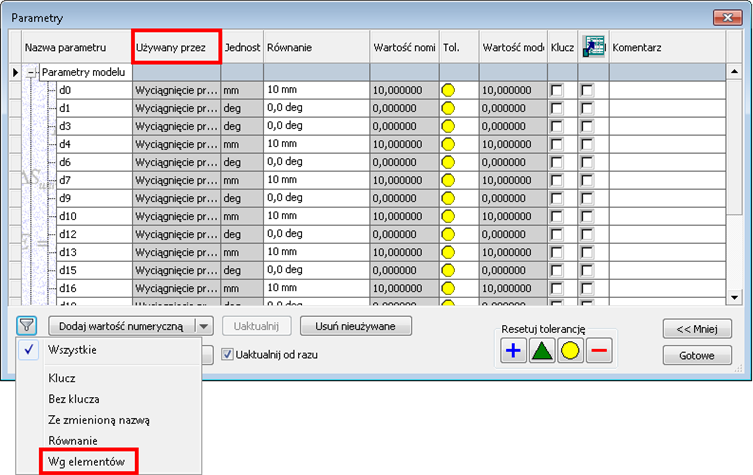 Okno dialogowe Parametry zostało ulepszone. Dodano kolumnę Używany przez i filtr Wg elementów.
