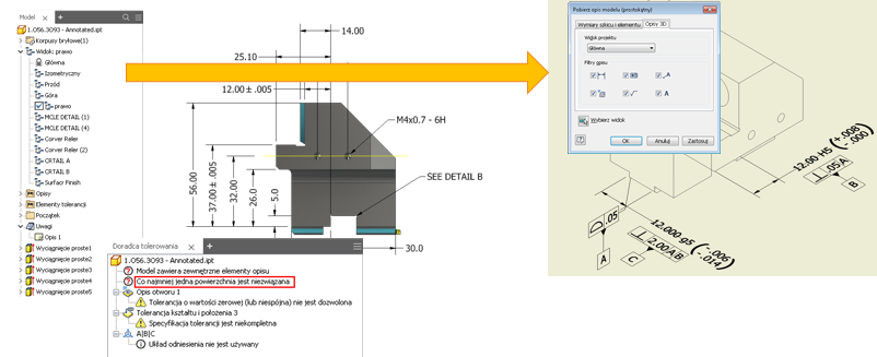 Definicja na podstawie modelu (MBD) to zaawansowany nowy zestaw narzędzi do dodawania opisów, GD&T i innych informacji na temat wykonania bezpośrednio do części 3D. Zintegrowany Doradca tolerowania umożliwia sprawdzenie stanu schematu tolerowania i wyświetlenie listy potencjalnych problemów, błędów i innych informacji w przeglądarce Doradca tolerowania. Gdy model 3D zawiera opisy MBD i 3D, można odzyskać je na rysunku 2D, wyeksportować w formacie PDF 3D lub STEP AP242.