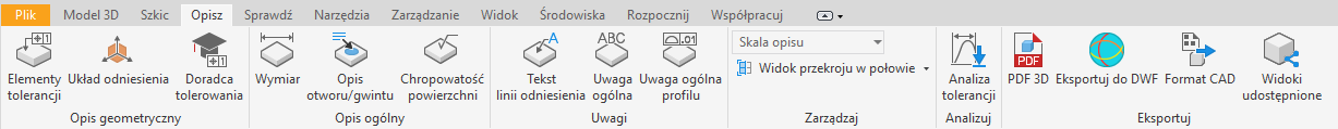 Aby uzyskać dostęp do poleceń opisów 3D, użyj nowej karty Opisz w pliku części i dodaj informacje na temat wykonania bezpośrednio do modelu 3D.