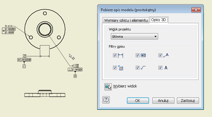 Nowa karta Opisy 3D w oknie dialogowym pobierania umożliwia uzyskanie informacji o definicji MBD z części i użycie ich w rysunku. Użyj listy rozwijanej Widok projektu i opcji filtru, aby wyświetlić żądane informacje.