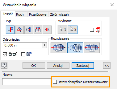Domyślnie podczas tworzenia wiązania osiowego w programie Inventor jest podejmowana próba przewidzenia najlepszego rozwiązania dla utworzenia wiązania. Nowe ustawienie, Ustaw domyślnie Niezorientowane, umożliwia trwałe przywrócenie starszego zachowania, którym było domyślne przypisywanie ustawienia Niezorientowane.