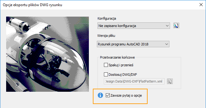 Proces eksportowania i zapisywania pliku jako rysunku programu AutoCAD został usprawniony zgodnie z poniższym opisem: