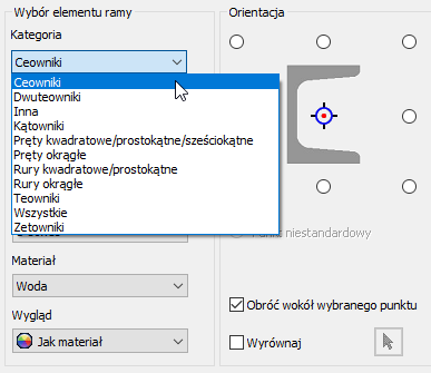Nowa sekcja Kategoria została dodana do obszaru Wybór elementu ramy w poleceniach Wstaw i Zmień, aby poprawić wyszukiwanie określonej rodziny. Po wybraniu kategorii kształtownika konstrukcyjnego lista Rodzina jest filtrowana, aby wyświetlić tylko dostępne opcje.