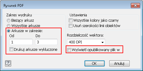 - Zaznaczenie nowej opcji Wyświetl opublikowany plik w przeglądarce powoduje, że arkusze są wyświetlane w programie Adobe Acrobat Reader po naciśnięciu przycisku Zapisz.
