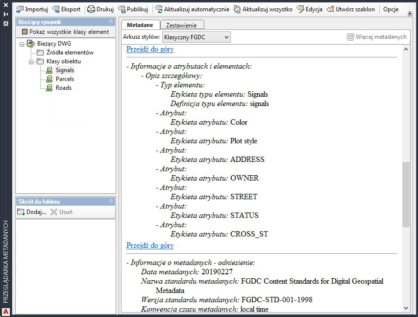 Jeśli rysunek zawiera sklasyfikowane obiekty, jego metadane są automatycznie generowane i wyświetlane po pierwszym otwarciu przeglądarki metadanych.