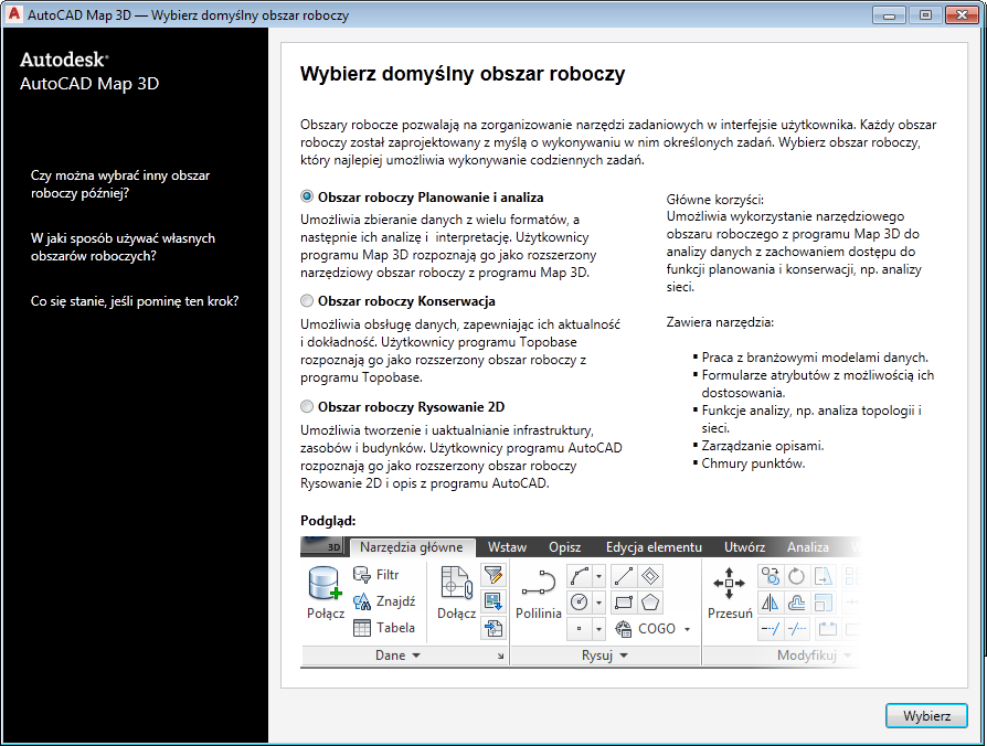 Program AutoCAD Map 3D toolset zawiera wstępnie zdefiniowane obszary robocze. W każdym obszarze roboczym polecenia i paski narzędzi są uporządkowane i wyświetlane w inny sposób. Przy pierwszym uruchomieniu programu AutoCAD Map 3D toolset wyświetlany jest monit o wybranie domyślnego obszaru roboczego.