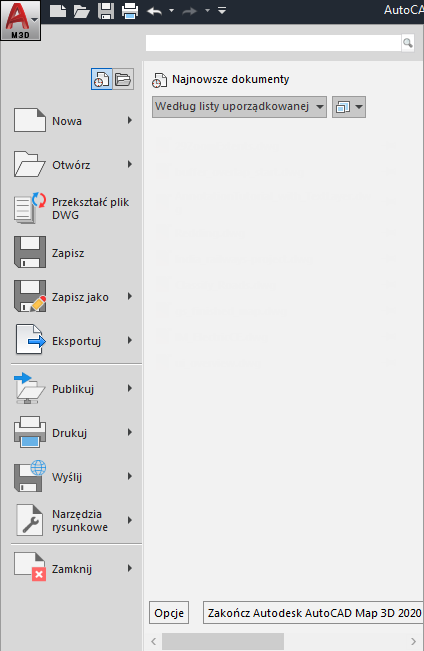 Menu aplikacji zawiera pole wyszukiwania oraz polecenia związane z plikami. Polecenie Opcje powoduje wyświetlenie okna dialogowego Opcje programu AutoCAD, w którym dostępne są ustawienia sterujące takimi parametrami, jak np. kolor tła map.