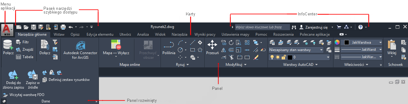 Karty widoczne w górnej części okna programu AutoCAD Map 3D toolset nazywane są wstążką.