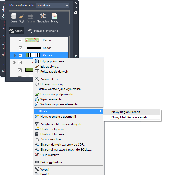 Wszystkie elementy w programie AutoCAD Map 3D toolset mają niestandardowe menu zawierające polecenia właściwe danemu elementowi w danej chwili.