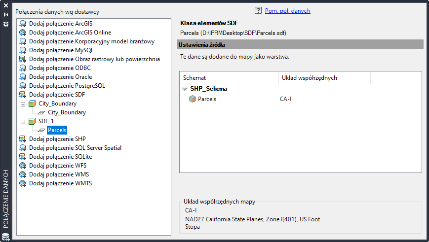 Funkcja Połączenie danych umożliwia wyświetlenie informacji o wszystkich źródłach danych innych niż dane DWG, nawet jeśli nie zostały one dołączone za jej pomocą. Przykładowo: plik SDF, który został przeciągnięty i upuszczony na mapie, jest wyświetlony w oknie dialogowym Połączenie danych.