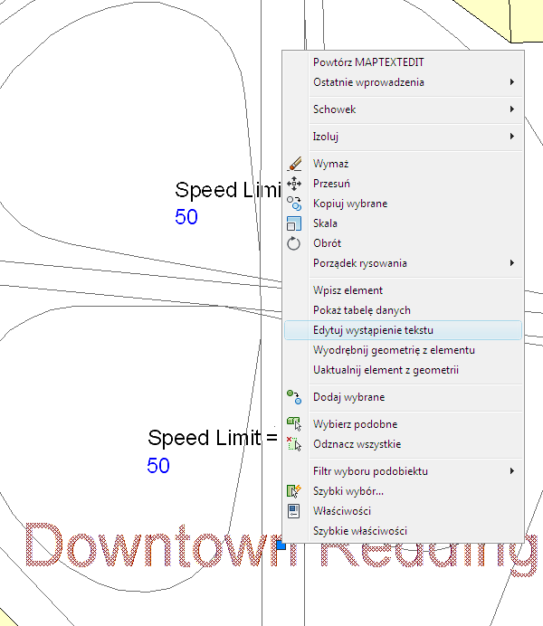 Każdy opis jest jednym „wystąpieniem tekstu”. Do warstwy tekstu można dodać wiele wystąpień tekstu. Po późniejszym uzyskaniu połączenia z warstwą tekstu wszystkie wystąpienia tekstu zostaną wstawione na mapie.