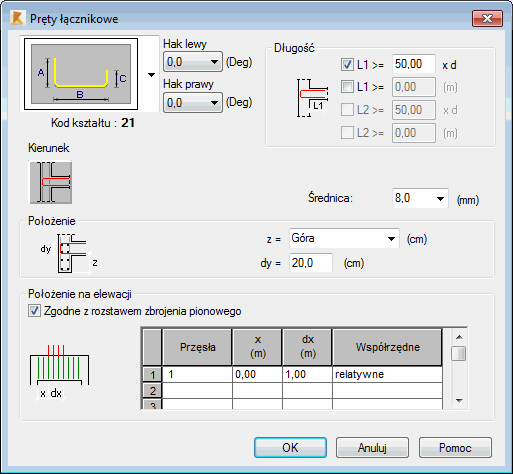 Aby dodać kolejną grupę prętów łącznikowych, należy każdorazowo zdefiniować ją w powyższym oknie dialogowym.